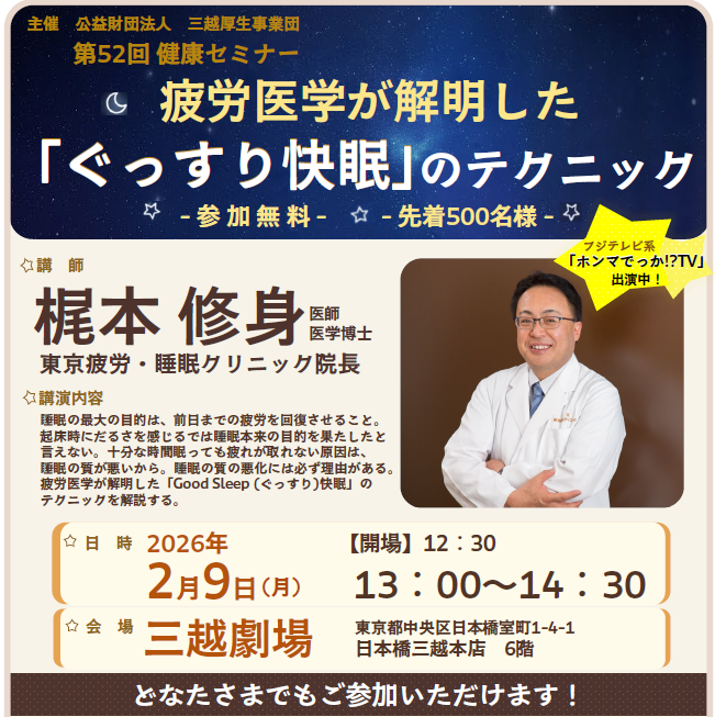 演題:疲労医学が解明した「ぐっすり快眠」のテクニック